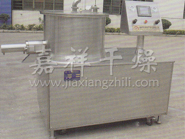本机是通过设置旋转离心盘、鼓风机、气动喷枪,将湿颗粒制成美丽的球丸。将前道工序做成的湿颗粒投入旋转离心盘内,启动鼓风机后再将旋转离心盘启动,使湿颗粒受到环隙空气浮力、旋转离心力、自身重力作用,呈环周绳股状运动,从而形成真球度极高的球丸。